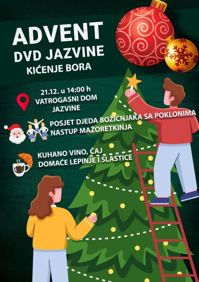 Također, Dobrovoljno vatrogasno društvo Jazvine poziva sve mještane i posjetitelje na Advent u Jazvinama, koji će se održati u nedjelju, 21. prosinca, s početkom u 14:00 sati, kod Vatrogasnog doma Jazvine.