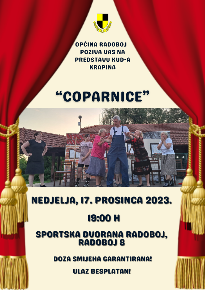 Općina Radoboj poziva i na predstavu „Coparnice“ KUD-a Krapina. Tekst predstave napisao je Stjepan Škvorc, za adaptaciju teksta i režiju zaslužna je Anita Tušek uz asistenta Franju Oreškog i scenografkinju Zdenku Lazar. Predstava će se izvesti u nedjelju, 17. prosinca 2023. s početkom u 19:00 h u Sportskoj dvorani u Radoboju. Ulaz na predstavu je besplatan. Dođite svi pogledati ovu zanimljivu i šaljivu predstavu!