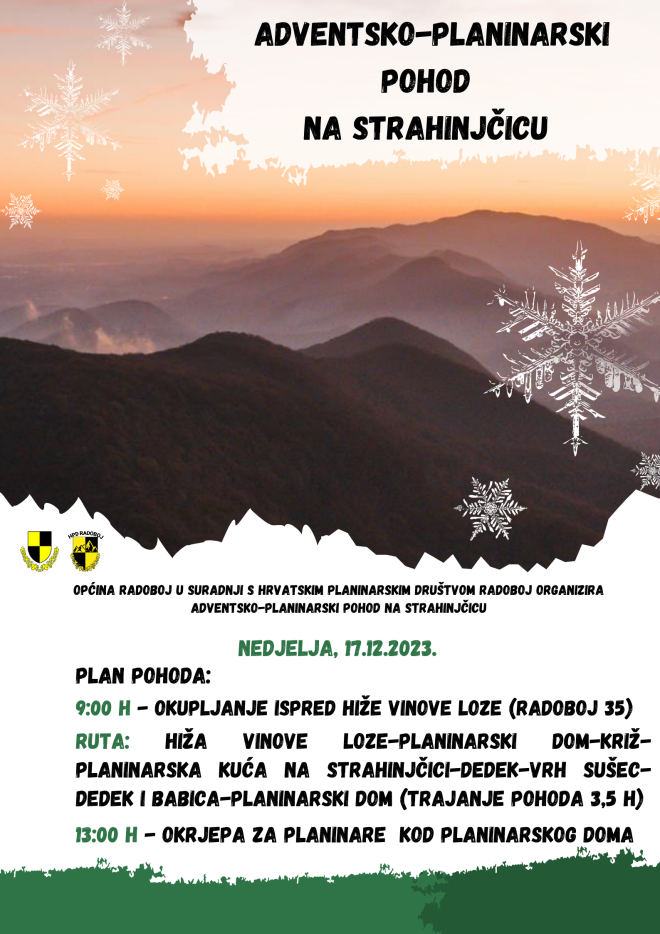 Općina Radoboj u suradnji s Hrvatskim planinarskim društvom Radoboj organizira Adventsko-planinarski pohod na Strahinjčicu u nedjelju, 17. prosinca 2023. Okupljanje je u 9:00 h ispred Hiže vinove loze (Radoboj 35).
