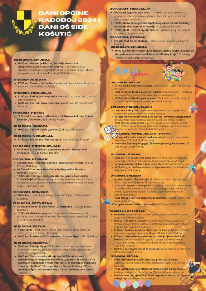 Ovaj bogat i raznovrstan program realiziran je u suradnji s OŠ Side Košutić, Dječjim vrtićem Škrinjica, Muzejom Radboa, Društvom Naša djeca Radoboj i sportskim udrugama. Pod motom “Ljubav djeci prije svega” od 7. do 13. listopada održati će se Dječji tjedan, tradicionalna godišnja manifestacija posvećena djeci koja obuhvaća brojne aktivnosti. Ususret Dječjem tjednu danas će se u Sportskoj dvorani održati znanstvene radionice Mobilnog planetarija i Mobilnog parka znanosti, a biti će tu znanstvenih dana, obilježavanje Međunarodnog dana djeteta, radionica uz igre i druženja, predstava „Huligan“, predavanja, prezentacije i obilježiti će se Međunarodni dan djevojčica.
