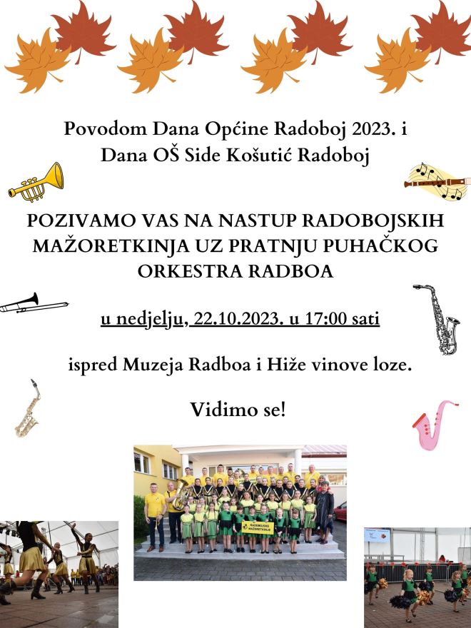 ''Dođite u nedjelju, 22. listopada 2023. ispred Muzeja Radboa i Hiže vinove loze, doživite radost i veselje uz zvuk i melodije Puhačkog orkestra Radboa te podržite uvijek sjajne Radobojske mažoretkinje. Vidimo se!'' - poručuju organizatori.