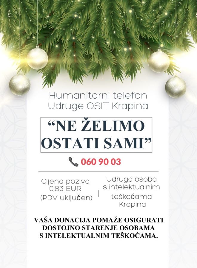 Pozivom na broj 060 90 03 donirate 0,83 EUR te pomažete osigurati dostojno starenje osobama s intelektualnim teškoćama. - Humanitarni telefon otvoren je do kraja 1. mjeseca 2025. godine, te vas ovim putem pozivamo da se uključite u humanitarnu akciju i podržite Udrugu osoba s intelektualnim teškoćama Krapina u ovo nadolazeće vrijeme blagdana koje smatramo najljepšim u godini - poručuje Udruga.