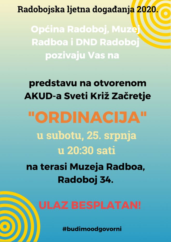 Općina Radoboj, Muzej RADBOA i DND Radoboj pozivaju vas na predstavu „ORDINACIJA“ AKUD-a Sveti Križ Začretje koja će se održati u sklopu Radobojskih ljetnih događanja 2020. Predstava će se održati sutra, 25. srpnja u 20:30 sati na terasi Muzeja Radboa na adresi Radoboj 34. Ulaz na predstavu je besplatan.