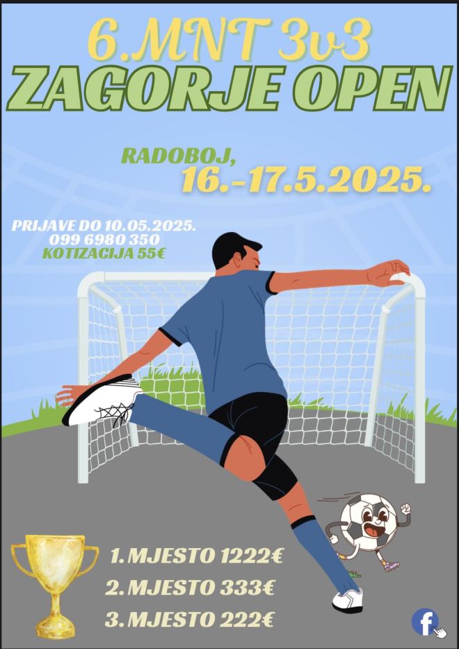 U organizaciji Športske udruge Radoboj, 16. i 17. svibnja 2025. godine, na sportskom igralištu kod Osnovne škole Side Košutić u Radoboju održat će se šesti malonogometni turnir 3V3 Zagorje Open.