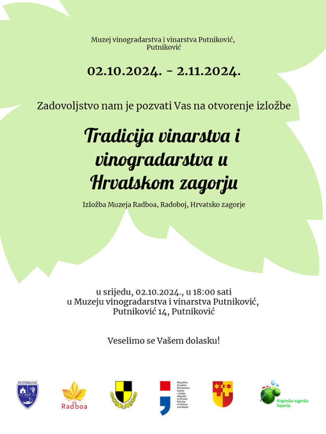Također, Muzej Radboa ugostiti će i izložbu „Vino u tradicijskoj kulturi Pelješca“ Muzeja vinogradarstva i vinarstva Putniković, koja će biti otvorena u Radoboju, u Hiži vinove loze, 15.10.2024., u 18:00 sati.