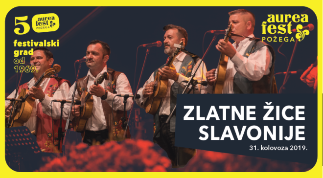 U SUBOTU 31. KOLOVOZA U VEČERNJIM SATIMA U DVORANI GLAZBENE ŠKOLE POŽEGA UŽIVAT ĆEMO UZ HRVATSKU GLAZBENU DIVU GABI NOVAK U PRATNJI SINA MATIJE DEDIĆA, jednog od najboljih jazz pijanista ovih prostora. Nakon toga na središnjem požeškom trgu slijedi Aurea fest Zlatne žice Slavonije, gdje će tradicionalno biti predstavljene nove pjesme na najpoznatijem i najdugovječnijem tamburaškom festivalu u svijetu. Od do sada poznatih izvođača očekuje se dolazak Slavonskih Dukata, Stjepana Jeršeka Štefa, Ćire Gašparca, Šime Jovanovca, Marije Pavković, Viktorije Kulišić, Kristalai mnogih drugih. Po završetku Zlatnih žica Slavonije, legende hrvatske tamburaške scene Slavonske lole će na Trgu sv. Trojstva održati samostalni koncert. U pješačkoj zoni u ponoć započinje drugi Aurea retro party uz jedan od najenergičnijih domaćih soul bendova, zagrebačke Soul Fingerse.
