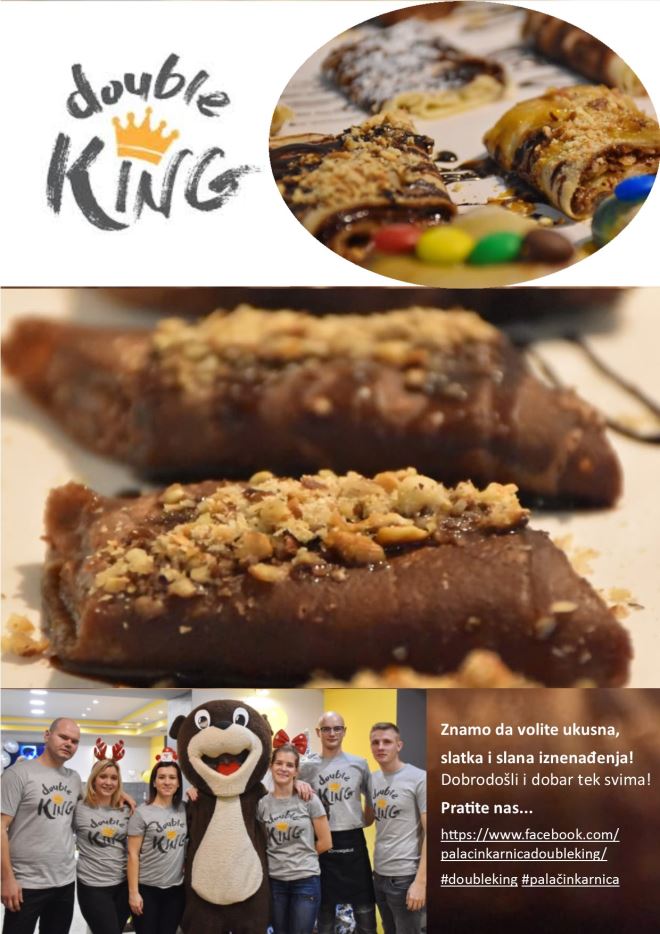 DRAGI SLADOKUSCI... ZNAMO DA VOLITE UKUSNA, SLATKA I SLANA IZNENAĐENJA! Znamo da volite otkrivati nove, ugodne ambijente i interijere u kojima možete opušteno uživati u čarima slatkih i slanih specijaliteta. Zato smo odlučili da u centru Krapine, na adresi Ljudevita Gaja 16, u novootvorenoj palačinkarnici Double King, započne Vaša slatka, blagdanska idila.
