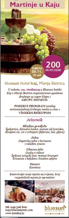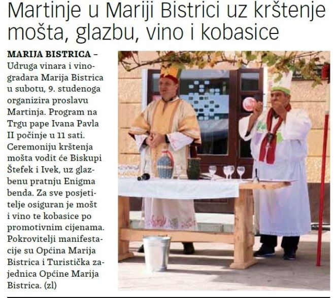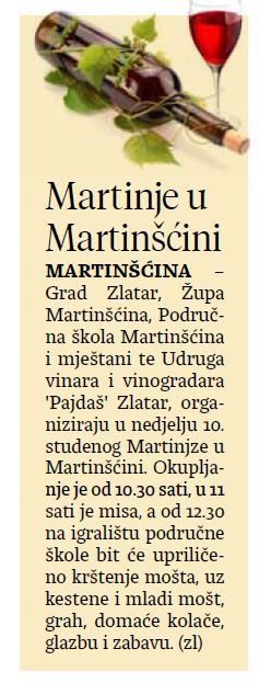 Blagdan sv. Martina, zaštitnika vinara i vinograda, slavi se u cijeloj Hrvatskoj, no njegov dan osobito je značajan stanovnicima na sjeveru zemlje. U sjevernoj Hrvatskoj, a tako i u Hrvatskom zagorju, na Martinje njeguje se tradicionalni pučki običaj simboličkog prevođenja mošta u mlado vino, odnosno 'krštenje' mošta. Tada brojni ljubitelji dobre kapljice dolaze na svoje - u mjestima u kojim je sveti Martin zaštitnik, pripremaju se tradicionalne glazbene i folklorne zabave, a na proslavama najčešće se priprema martinjska guska i mlinci, koji se, naravno, zaliju dobrom kapljicom.