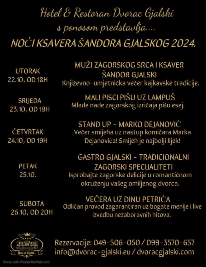 Dva dana ranije, u četvrtak 24. listopada, od 19 sati na rasporedu je večer smijeha, kada će goste Hotela & Restorana 'Dvorac Gjalski' zagarantirano do suza nasmijati regionalna zvijezda stand-up komedije, popularni Marko Dejanović.