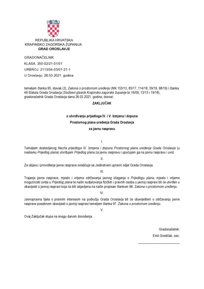 Gradonačelnik Grada Oroslavja, Emil Gredičak donio je dva zaključka. Jedan od njih je Zaključak o utvrđivanju prijedloga II. Izmjena i dopuna Urbanističkog plana uređenja radne zone „Mokrice“ za javnu raspravu, a drugi Zaključak o utvrđivanju prijedloga IV. i V. Izmjena i dopuna Prostornog plana uređenja Grada Oroslavja za javnu raspravu. Pogledajte ih u cijelosti.