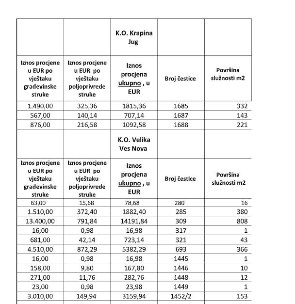 U nastavku se navode zemljišno-knjižne čestice koju su predmetom zahvata, njihova površina( koridor/površina služnosti) , te pripadajući iznos naknade, izražen u eurima: