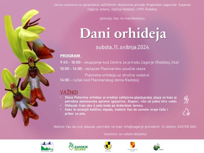 Javna ustanova za upravljanje zaštićenim dijelovima prirode Krapinsko-zagorske županije Zagorje zeleno, Općina Radoboj i HPD Radoboj pozivaju Vas na manifestaciju DANI ORHIDEJA.