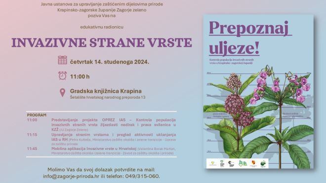Javna ustanova Zagorje zeleno organizira edukativnu radionicu o invazivnim stranim vrstama u sklopu projekta OPREZ IAS, koja će se održati u četvrtak, 14. studenoga 2024., s početkom u 11:00 sati u Gradskoj knjižnici Krapina (Šetalište hrvatskog narodnog preporoda 13).