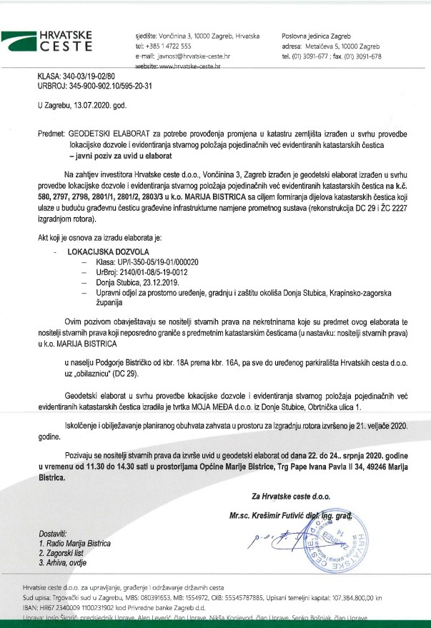 Hrvatske ceste objavljuju javni poziv za uvid u geodetski elaborat, radi rekonstrukcije državne ceste DC 29 i županijske ceste ŽC 2227, izgradnjom rotora, nositeljima stvarnih prava, koji graniče sa zemljišnim česticama, koje su predmet rekonstrukcije u kat. općini Marija Bistrica, u naselju Podgorje Bistričko od kućnog broja 18A prema kućnom broju 16A, sve do uređenog parkirališta Hrvatskih cesta uz obilaznicu – državne ceste DC 29.