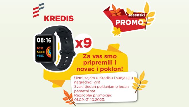 I ove jeseni Kredis je osmislio veliku jesensku promotivnu kampanju koja donosi dodatnu korist građanima! Osim što će podmiriti svoje financijske obaveze, imat će priliku osvojiti jedan od čak devet pametnih satova. Svi klijenti koji se odluče za Kredisov zajam u razdoblju od 1. rujna do 31. listopada 2023. automatski ulaze u izvlačenje za ovu vrijednu nagradu. Izvlačenje će biti svaki tjedan, što znači da svatko ima veliku šansu postati novi vlasnik elegantnog i funkcionalnog "smartwatcha".