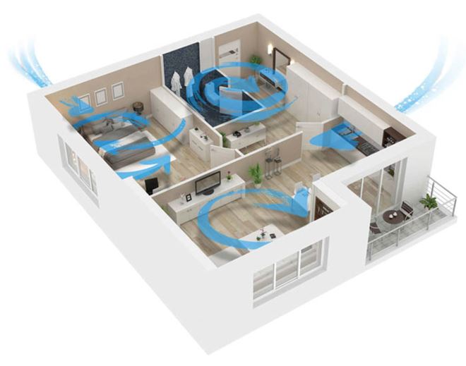 Preporučujemo ga ugraditi u dnevni boravak ili spavaću sobu. Sav taj proces rada rekuperatora , odvija se 24 sata na dan uz 20dcb, što bi mogli usporediti sa šapatom u daljini. Rekuperator I-vent dodatno komunicira s jedinicom postavljenom u kuhinji ili kupaonici te na principu podtlaka stvara harmoniju u zraku.