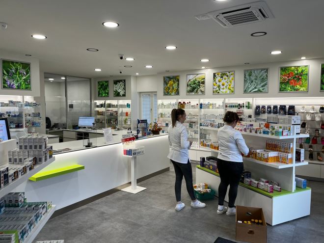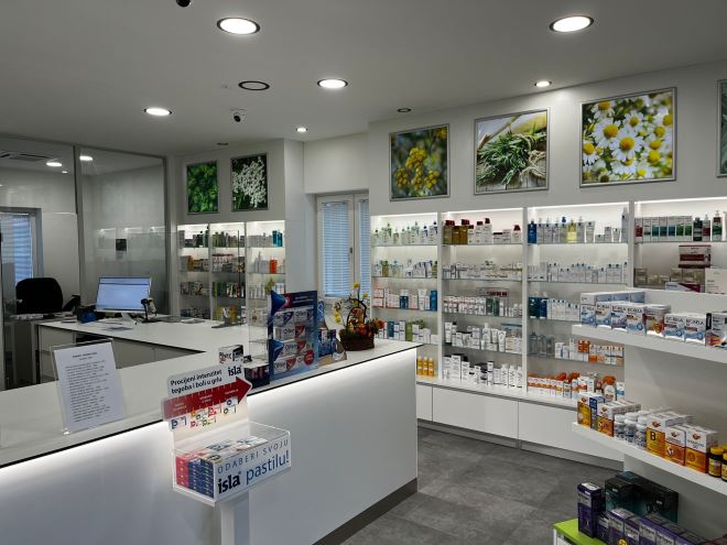 Velik i prekrasan prostor ljekarne nudi širok asortiman lijekova, kozmetike, dodataka prehrani, tlakomjera i sličnih malih uređaja koji se koriste u zdravstvene svrhe.