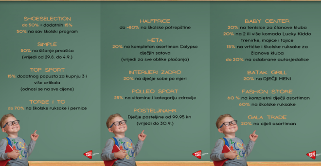 Kako bi mališani spremno dočekali novu školsku godinu Westgate je pripremio i odlične popuste. Krenite u potragu za najboljim tenisicama, haljinicama, trapericama, jaknicama, ali i školskim torbama i opremite svog školarca na vrijeme. Čekaju vas supeeeer popusti na odjeću, obuću, školski pribor, ali i na uređenje dječjih soba, dodatke i još mnogo toga što će svaki pravi modni mališan nositi na školskim hodnicima ove godine.