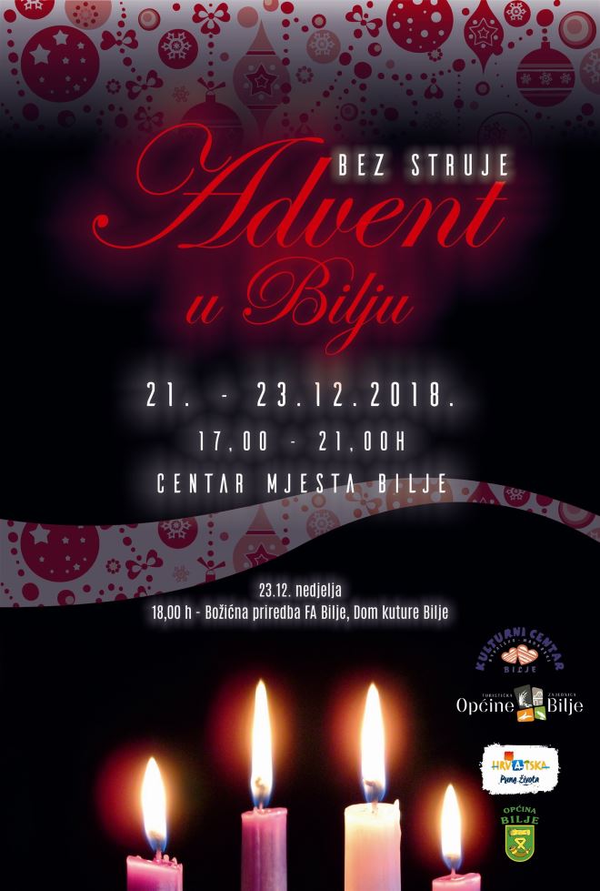 Svaki dan adventa, možete u posebnom, zimskom ruhu posjetiti Kopački rit i doživjeti ovo mitsko mjesto u zagrljaju zime; naša je preporuka najaviti svoj dolazak i provozati se toplim vlakićem, u primjerenom blagdanskom ruhu. Zadnji adventski tjedan, točnije dani od 21. – 23. prosinca posebno će biti svečani u Bilju. Središte mjesta dobiti će svoj adventski sajam, osvjetljen tisućama svijeća, fenjera i otvorenih plamena. Osim ambijenta, bez struje će se odvijati i program, uz zborove koji pjevaju božićne pjesme, bendova bez razglasa, muzičkih kutija i uličnih glazbenika. Prigodna će biti i ponuda hrane i toplih napitaka, jer će se sve po starim receptima pripremati na nekoliko starih seoskih peći -"šporeta". Ukrasi od slame, borovine i sušenog voća upotpunit će ovaj doživljaj i dokazati da je čaroban Božić moguće imati i bez struje!