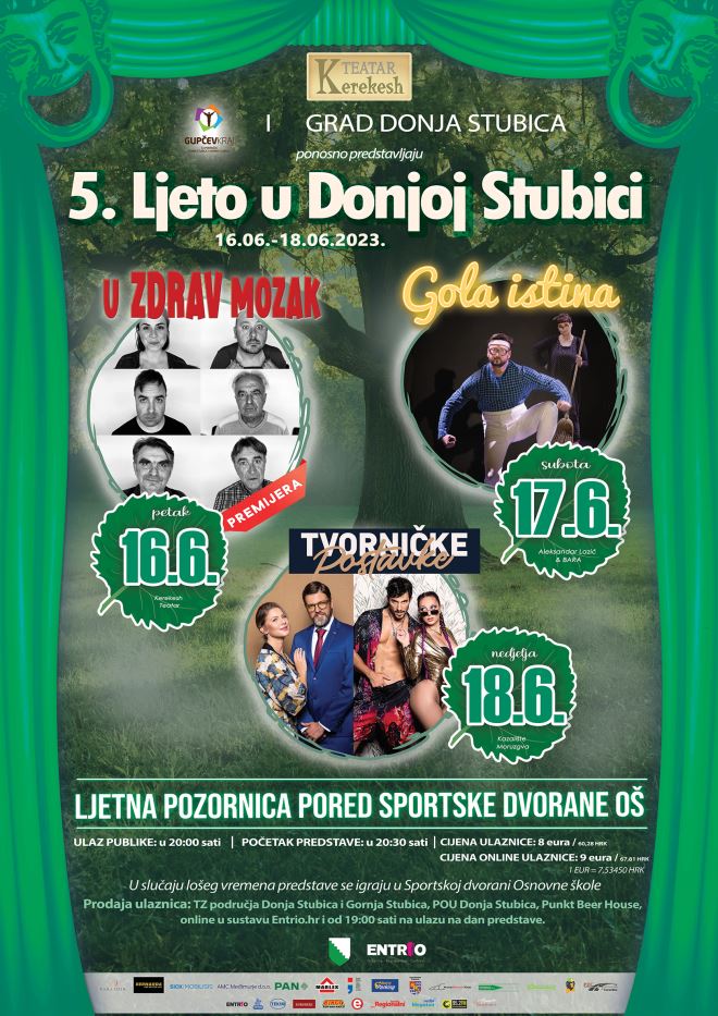 Vikend pred nama očekuje nas prava kazališna poslastica. Neponovljivi Kerekesh Teatar ponovno će nas nasmijati od 16. do 18. lipnja. Pogodili ste, riječ je o manifestaciji - 5. LJETO U DONJOJ STUBICI koja u organizaciji Kerekesh Teatra, Grada Donja Stubica i TZ područja Gornja i Donja Stubica donosi tri vrhunske komedije, uz par noviteta. Za još veći smijeh i bolju atmosferu, ovogodišnja će se manifestacija održati kroz cijeli vikend!