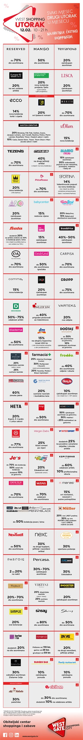 Westgate Shopping City kupcima donosi najbolje popuste u kojima će uživati baš svi uzrasti. Svakog mjeseca, drugi utorak u mjesecu od 10 do 21 sat na West Shopping Utorku možete obogatiti svoju garderobu uz mnogo super popusta poznatih brendova kao što su Reserved, Mango, Di Caprio by Varteks, s.Oliver, Europa 92, Terranova, Adidas, Mass, House, New Yorker, Deichmann i mnogi drugi.