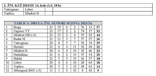 Iako se sve važno u 2. zagorskoj nogometnoj ligi već dogodilo i Sloga je već proslavila naslov, službeno će sezona završiti ove nedjelje, kada su na rasporedu dvije zaostale utakmice 14. kola. U nedjelju u 18 sati Vatrogasac će dočekati Lobor, a Toplice Mladost Belec. Utakmice nemaju gotovo nikakav značaj. Vatrogasac je sigurno peti, Toplice su sigurno 11., Lobor bi pobjedom mogao skočiti sa desetog na osmo mjesto, a Mladost B sa bodom sa sedmog na šesto mjesto.