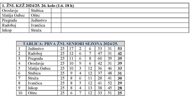 Pred nama 26. kolo 1. zagorske nogometne lige. Riječ je o predzadnjem kolu, koje može otkriti i zadnju dvojbu, o ekipi koja ispada iz lige. Prvak je odavno poznat, Jedinstvo, koje u ovom kolu u derbiju gostuje kod Pregrade, koja će pokušati u zadnjoj domaćoj utakmici uzeti skalp prvaku. Lokalni derbi će igrati Oroslavje i Stubica, koja je osigurala opstanak, pa će utakmica biti lišena dramatike oko toga. Inkop i Straža igraju utakmicu koja pobjedniku može potpuno osigurati ostanak u ligi, a poraženi će čekati rezultat Oštrca, koji gostuje kod Matije Gupca i mora pobijediti da bi imao bilo kakvu šansu. S druge strane Matija Gubec je opstanak osigurao pobjedom kod prvaka Jedinstva u ponedjeljak. Radoboj dočekuje Ivančicu. Domaćini se bore da zadrže drugo mjesto, a Ivančici treba pobjeda da sigurno osigura opstanak i bez drugih rezultata.