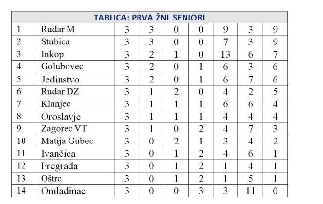 Nakon tri kola dvije su ekipe sa maksimalnim učinkom u 1. zagorskoj ligi. To su Rudar M, koji je u derbiju pobijedio Golubovec sa 3:1 i Stubica koja je sa 2:0 slavila kod Pregrade. Gol razliku trenutno bolu ima Rudar M pa je on načelu, a iza Stubice je sa 7 bodova Inkop, koji je pobijedio u ovom kolu Omladinac sa 5:1.. Golubovec je tako s 1. pao a 4. mjesto sa 6 bodova, koliko ima i Jedinstvo na 5. mjestu, nakon pobjede kod Matije Gupca 3:2.