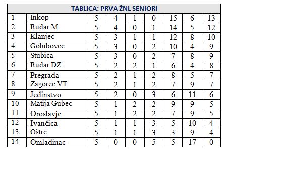 U derbiju 5. kola 1. zagorske lige, u susretu dvije neporažene ekipe do nedjelje, Inkop je sa 1:0 pobijedio Rudar DZ. Time je Inkop ostao jedina neporažena ekipa i vodi sa 13 bodova. Rudar M je sa 4:0 pobijedio Stubicu i sada je drugi sa 12 bodova, a do trećeg mjesta se probio Klanjec, koji je sa 3:0 slavio kod Jedinstva, i sada ima 10 bodova.