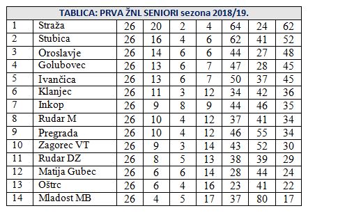 U Humu na Sutli je bilo 5:1 za Stražu, pa pobjeda Ogulina od 2:1 u uzvratu u Ogulinu nije pomogla prvaku karlovačke županije. Bravo Straža još jednom. Možda je malo više uzbuđenja bilo oko borbe za ostanak. Ma, sigurno je bilo više, no i tu se čini da je stvar riješena još nekoliko kola prije kraja kada je Matija Gubec pobijedio u Mariji Bistrici Mladost, i kako će se kasnije pokazati, sebe spasio, a Bistričance poslao u 2. zagorsku ligu. Mladost je na kraju osvojila samo 17 bodova, a na proljeće mizerna 4. Razočarao je i Oštrc. Iako se spasio, teško je vjerovati da nekoga u Zlataru raduje 13. mjesto sa 22 boda, i samo 6 na proljeće. No, vratimo se malo vrhu ljestvice. Drugo je mjesto osvojila Stubica, pomalo na japanski pogon, a sasvim zasluženo, 10 bodova manje od Straže, ali i 4 više od Oroslavja, koje također može biti zadovoljno sezonom. Golubovec je nakon nešto skromnijeg početka na proljeće, uhvatio ritam i na kraju stigao do vrlo dobrog 4. mjesta, a možda i najveće pozitivno iznenađenje je 5. mjesto Ivančice iz Zlatar Bistrice, koja ga je apsolutno zaslužila, sa dvije ujednačene polusezone. Vrlo promjenjivo je igrao Klanjec, ali ipak dovoljno za solidno 6. mjesto, iako je na kraju zaostao za Ivančicom 9 bodova, a na samo jedan bod stigao mu je Inkop.