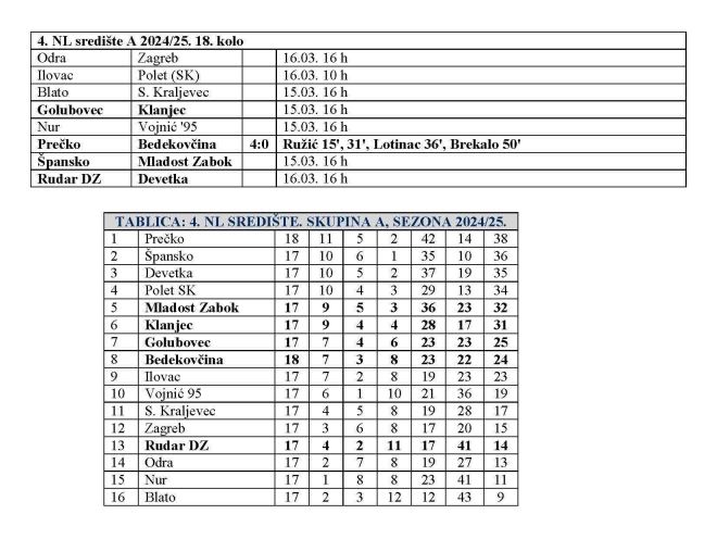 Već je krenulo 18. kolo 4. NL središte skupina A. Bedekovčina je sinoć gostovala kod Prečkog. Domaćini su slavili sa 4:0, a već na odmoru je bilo 3:0. I ovo kolo donosi jedan zagorski derbi. Danas se u 16 sati Novom Golubovcu sastaju Golubovec i Klanjec. Mladost Zabok ima teško gostovanje kod vodećeg Španskog, dok će sutra Rudar DZ dočekati Devetku u 16 sati. Danas će još Blato dočekati Sesvetski Kraljevec, a Nur će biti domaćin Vojniću '95. Sutra u 10 sati Ilovac dočekuje Polet (SK), dok će kolo završiti sutra od 16 sati, utakmicom Odra – Zagreb.