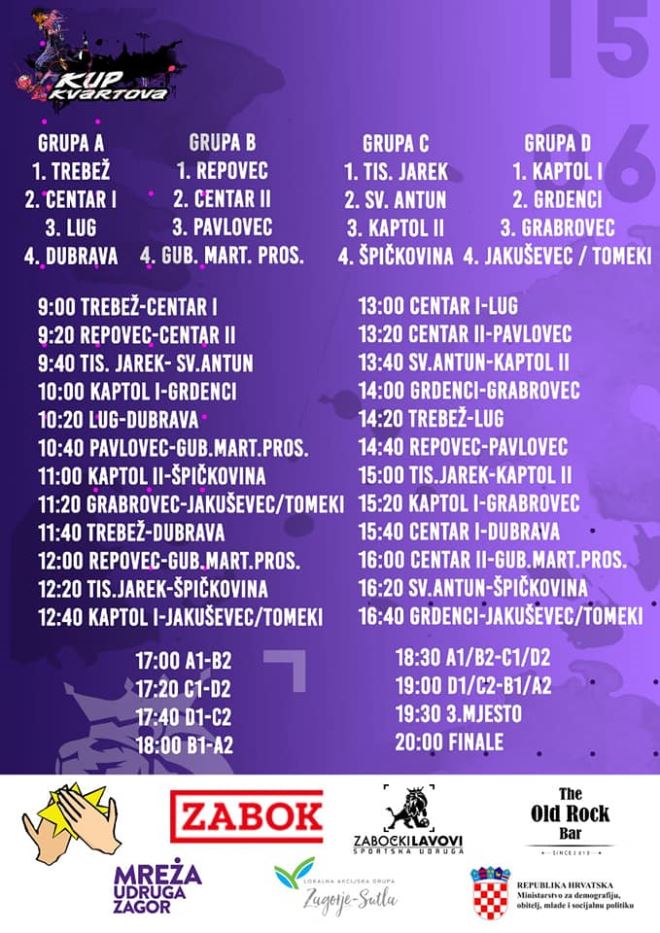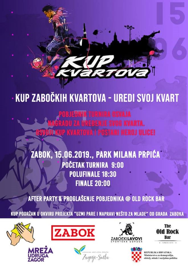 Kup zabočkih kvartova - uredi svoj kvart osvojio je najviše glasova Zabočanki i Zabočana na glasanju za naj projekt za mlade u Zaboku. To je malonogometni turnir koji će na jednom mjestu okupiti ekipe iz svih kvartova pod okrugom grada Zaboka. Na turniru će sudjelovati 20-ak ekipa te više od 120 igrača. Pobjednik turnira ostvaruje mogućnost da učini nešto za dobrobit svog kvarta te mu ostaje na izbor hoće li urediti dječje igralište, park ili sportsko igralište. Utakmice počinju od 9 ujutro, a finale je na rasporedu u 20 sati.
