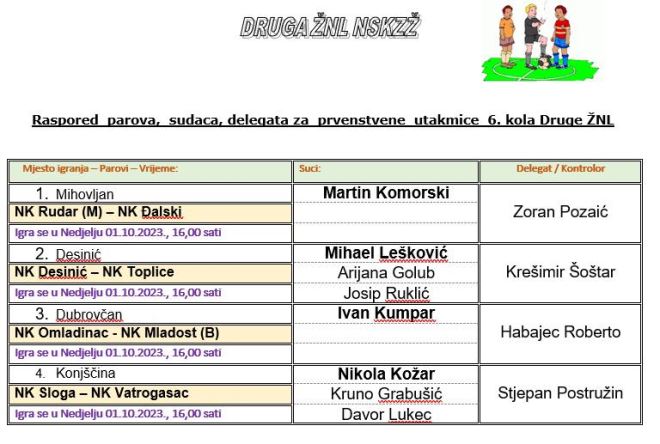 U 2. zagorskoj ligi na rasporedu je također 6. kolo, no odigrat će se tri utakmice, jer su utakmice Sloga - Vatrogasac i Lobor – Milengrad 2005. pomaknute za 12. studeni. Rudar M je domaćin Đalskom, Omladinac će biti domaćin Mladosti iz Belca, a Toplice pak dočekuju Desinić. Slobodan je Matija Gubec. Utakmice se igraju također s početkom u 16 sati.