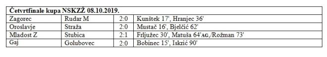 U utorak je odigrano četvrtfinale Kupa NSKZŽ. Baš kao i u osmini finala ni jedna utakmica nije otišla do penala, a zanimljivo je da su svi pobjednici zabili dva gola i to svi na domaćem terenu. Iznenađenje se dogodilo u Oroslavju, gdje je prvoligaš Oroslavje, koje ne stoji najbolje u 1. zagorskoj ligi izbacilo Stražu, koja sve uspješnije igra 4. NL središte.