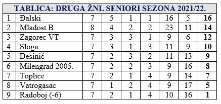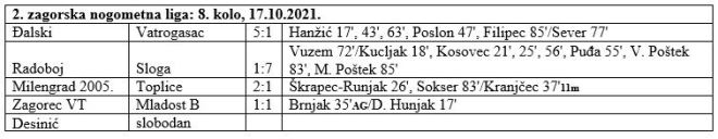 U nedjelju je odigrano 8. (pretposljednje jesensko) kolo 2. zagorske lige. U derbiju Zagorec VT i Mladost B odigrali su 1:1, što je na najbolji mogući način iskoristio Đalski, koji je pobjedom 5:1 protiv Vatrogasca zasjeo na 1. mjesto i osigurao naslov jesenskog prvaka. Naime Đalski sada ima 16 bodova. Mladost B ima 14, ali je slobodna u zadnjem kolu. Zagorec VT je na 3. mjestu s 12 bodova. Sloga je sa čak 7:1 slavila kod Radoboja i drži 4. mjesto sa 10 bodova, dok je Desinić, koji je bio u ovom kolu slobodan na 5. mjestu s 9 bodova. Na 6. mjesto probio se Milengrad 2005. s 8 bodova, nakon pobjede 2:1 protiv Toplica, koje su 7. sa 7 bodova. Na 8. mjestu je Vatrogasac sa 5 bodova, a Radoboj na začelju ima 1 bod. Pred nama je posljednje jesensko kolo u 2. zagorskoj ligi u kojoj će slobodna biti Mladost iz Belca. Nakon što je bio slobodan Desinić dočekuje Đalski. Toplice će biti domaćin Zagorec VT, a Sloga Milengradu 2005. U Radoboju istoimeni domaćin dočekuje Vatrogasac. Utakmice se igraju u nedjelju 24. listopada u 15.30 sati.