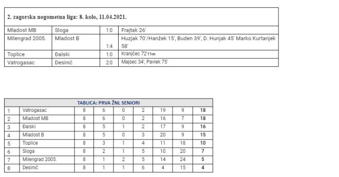 Krenula je i 2. zagorska nogometna liga i odmah donijela promjenu na čelu. Toplice su sa 1:0 pobijedili jesenskog prvaka Đalskog i skinule ga s prvog mjesta. Vatrogasac je sa 2:0 pobijedio Desinić, a Mladost MB sa 1:0 Slogu, pa sada Vatrogasac i Mladost imaju po 18 bodova, a Vatrogasac je na čelu, zbog bolje gol razlike. Đalski na 3. mjestu ima 16 bodova, a Mladost iz Belca, koja je na startu proljeća pobijedila Milengrad 2005. u gostima 4:1 drži 4. mjesto s 15 bodova.
