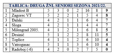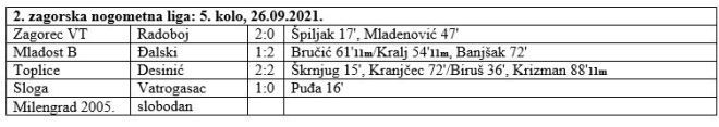 Ionako zanimljiva sezona 2. zagorske nogometne lige nakon 5. kola postala je još zanimljivija. Naime, Đalski je sa 2:1 slavio u Belcu kod vodeće Mladosti, koja i dalje drži sam vrh sa 9 bodova, ali se sada iza nje sve zgusnulo. Zagorec VT je slavio 2:0 protiv Radoboja i drži 2. mjesto s 8 bodova. Đalski je treći sa 7 bodova, koliko ima i Sloga, koja je s 1:0 pobijedila Vatrogasac. No, Đalski i Sloga imaju po utakmicu manje u odnosu na vodeću dvojku, pa zapravo stoje bolje kad pogledamo izgubljene bodove. Milengrad 2005. koji je u ovom kolu bio slobodan drži 5. mjesto s 5 bodova, koliko ima i šesti Desinić, koji je odigrao 2:2 kod Toplica, koje su na 7. mjestu sa 4 boda. I osmi Vatrogasac ima 4 boda, a zadnji Radoboj je bez bodova. Da Radoboj nije krenuo u sezonu sa minus 6 bodova, nakon 5. kola sve bi ekipe bile u 5 bodova, što dovoljno govori o izjednačenosti ove sezone. U 6. kolu vodeća Mladost B gostuje kod Radoboja, a u Budinšćini se sastaju Milengrad 2005. i Zagorec VT. Đalski dočekuje Toplice, a Desinić Slogu, dok je slobodan Vatrogasac. Utakmice se igraju u nedjelju 3. listopada u 16 sati.
