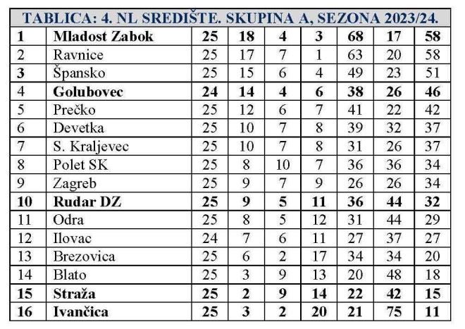 Danas se igra 26. kolo 4. NL središte skupina A. Na rasporedu su dva zagorska derbija. Golubovec dočekuje Stražu. Bodovi su važniji gostima, koji su u krizi realizacije, a iz kola u kolo se očekuje da prorade u napadu. S druge pak strane Golubovec više nema uteg borbe za naslov, ali nema ni kompletan 'roster'. U Zlatar Bistrici Ivančica će dočekati Rudar DZ. Domaćini svjesni da su pred ispadanjem, gosti u sigurnoj zoni, pa nervoze ne bi trebalo biti, već lijepa utakmica nadigravanja. Vodeća Mladost će u Zaboku dočekati Zagreb. Pobjeda je apsolutni imperativ, jer već u subotu na rasporedu je izravni derbi za naslov kod Ravnica.