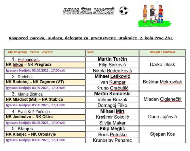 Danas se igraju utakmice 2. kola 1. i 2. zagorske nogometne lige. Jedna utakmica 1. lige počinje već u 16 sati. U Mariji Bistrici Mladost će dočekati Stubicu. Riječ je o uvijek zanimljivoj utakmici, pravom lokalnom derbiju, u koji ovaj puta Stubica ulazi kao favorit, ne samo danas, već i za cijelo prvenstvo. No, Mladost je krenula sjajnom pobjedom kod Oštrca, pa mirno može u susret. Klanjec će i drugu utakmicu igrati kao domaćim, ovaj puta protiv Oroslavja. Klanjec je krenuo sa 'samo' bodom, a ni danas neće bit jednostavno. Pregrada gostuje kod Inkopa, nakon poraza kod Zagorca VT, pa ni njoj neće biti lako, a Inkop želi nadograditi bod iz Klanjca. Vrlo zanimljivom čini se utakmica Jedinstvo – Oštrc, u koju i jedni i drugi ulaze sa porazima u 1. kolu i nakon ispadanja u kupu. Radoboj će pak biti domaćin Zagorcu VT, koji će htjeti nastaviti pobjedama, dok Radoboj nakon teškog poraza kod Stubice na startu, treba dizanje. Utakmice, osim u Mariji Bistrici, počinju u 17 sati.