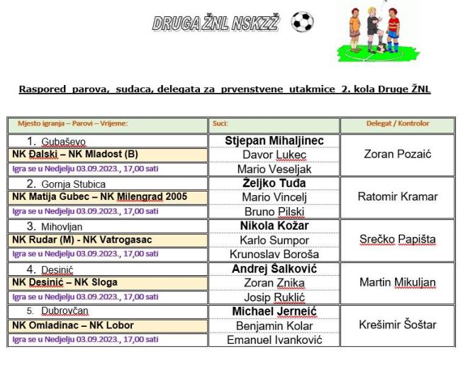 U 2. zagorskoj ligi Đalski dočekuje Mladost B i traži drugu pobjedu, dok će Mladost tražiti popravak dojma, nakon startnog poraza. Matija Gubec dočekuje Milengrad 2005. i ima pobjedu 'pod mus', nakon poraza na startu u Brezovi, ali i izbacivanja Oštrca u kupu. Rudar M i Vatrogasac su krenuli pobjedama, pa će u međusobnoj utakmici u Mihovljanu tražiti nastavak uspjeha. U Desiniću istoimeni domaćin dočekuje Slogu, nakon što su i jedni i drugi poraženi na startu dok će prvu utakmicu sezone u ligi odigrati Omladinac, koji dočekuje Lobor. Slobodne su Toplice. Utakmice se igraju u 17 sati.