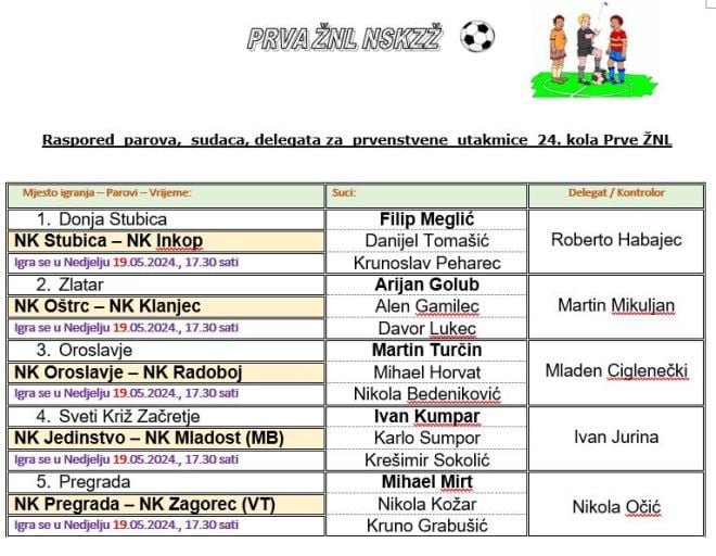 Danas se nastavlja natjecanje u 1. zagorskoj nogometnoj ligi. na rasporedu je 24. kolo, a posebno je zanimljiva borba za opstanak. No, 24. kolo donosi dva ogleda top pet ekipa. Prvak Klanjec gostuje kod Oštrca, a Stubica dočekuje Inkop. Utakmica važna u borbi za opstanak igra se u Svetom Križu Začretju, gdje Jedinstvo dočekuje Mladost MB. Slična je situacija i u Oroslavju, gdje gostuje Radoboj. Pregrada dočekuje posljednji Zagorec VT. Utakmice se igraju s početkom u 17.30 sati.