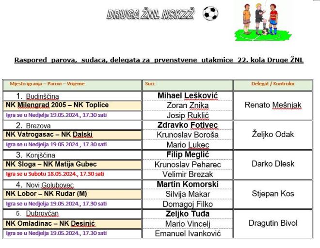 Što se pak tiče druge zagorske lige, na rasporedu je 22. kolo, zadnje prije doigravanja. Već jučer odigran je derbi u Konjščini, gdje je Sloga dočekala vodeći Matija Gubec. Lider je slavo sa 3:1 i na najbolji način čeka doigravanje. Ostale utakmice igraju se danas. Rudar M još ganja doigravanje i za to mu treba pobjeda kod Lobora. Vatrogasac dočekuje Đalski, a na rasporedu su i međusobni ogledi zadnje četvorke na ljestvici. Milengrad 2005. dočekuje Toplice, a Omladinac Desinić. Slobodna je Mladost B. Početak današnjih utakmica je u 17.30 sati.