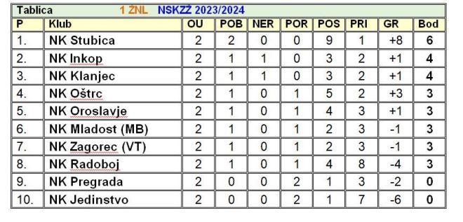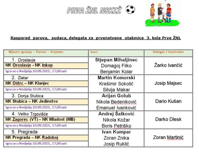 Danas se igra 3. kolu 1. zagorske nogometne lige. Nakon uzbuđenja u prva dva kola i pomalo iznenađujućih rezultata, bez sumnje nas i danas čekaju zanimljive utakmice. Vodeća Stubica dočekuje zadnje Jedinstvo. Stubica želi nastaviti savršeni niz na startu, dok Jedinstvo u prva dva kola nije osvojilo ni bod. Zanimljivo će biti i u Zlataru, gdje Oštrc dočekuje Klanjec, a Pregrada će nakon dva gostovanja i oba poraza, tražiti prvu pojedu protiv Radoboja. Zagorec VT će dočekati Mladost MB, a Oroslavje Inkop. Utakmice se igraju u 17 sati.