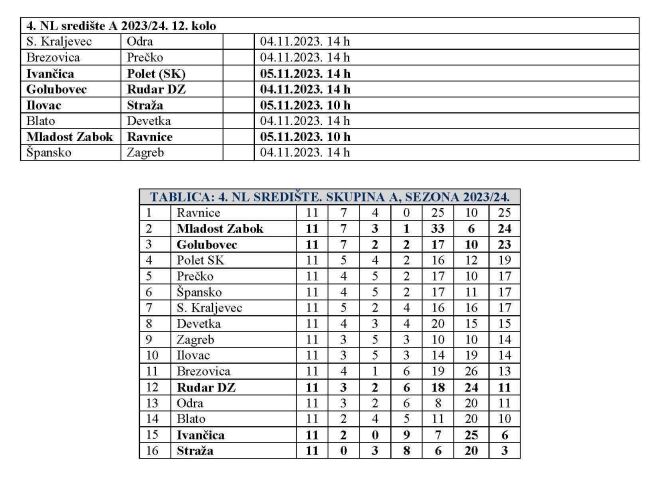 Pred nama je 12. kolo u 4. NL središte skupina A, koje donosi veliki derbi dvije vodeće ekipe. Naime, Mladost u Zaboku sutra u 10 sati dočekuje Ravnice. Izravni je to dvoboj za vodstvo, jer Ravnice na vrhu imaju bod više od Mladosti. No, kada počne sutrašnja utakmica, moguće je da će na vrhu biti Golubovec, koji zaostaje dva boda za Ravnicama, a svoju utakmicu 12. kola igra već danas. U zagorskom derbiju dočekuje Rudar DZ u 14 sati. Preostala dva zagorska predstavnika igrat će sutra. Straža će sutra u 10 sati gostovati kod Ilovca, dok će Ivančica sutra u 14 sati dočekati Polet (SK). Evo svih parova i trenutne ljestvice.