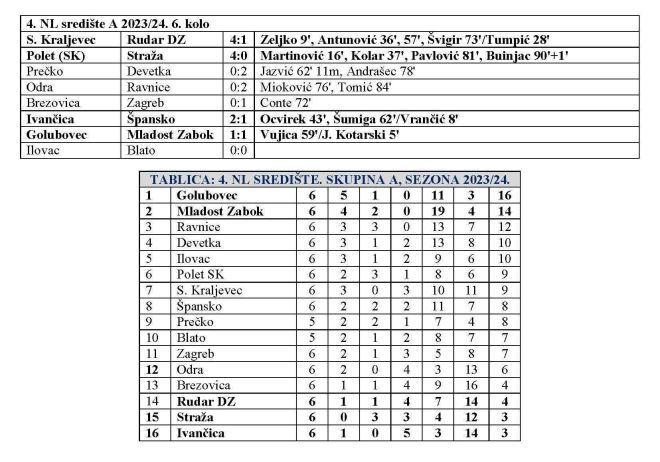 Iza nas je 6. kolo 4. NL središta skupina A, koje je donijelo i najveći derbi, a ujedno i zagorski. Neporaženi Golubovec i Mladost Zabok igrali su za izravno prvo mjesto, a završilo je 1:1. Gosti su rano poveli, no domaćini su uspjeli u nastavku izjednačiti. U subotu, kada je igran ovaj derbi, još su dvije zagorske ekipe igrale, ali nažalost doživjele su visoke poraze. Sesvetski Kraljevec je sa 4:1 pobijedio Rudar DZ dok je Polet (SK) sa 4:0 porazio Stražu. No, stigla je prve pobjeda Ivančice, koja je nakon preokreta sa 2:1 pobijedila Špansko. Ljestvicu je iz zagorskog kuta dobro gledati sa vrha, gdje i dalje vode Golubovec sa 16 i Mladost Zabok sa 14 bodova. No, ostatak zagorske ekipe smjestio se na dno. Rudar DZ je na 14. mjestu sa 4 boda, Straža i Ivančica su na 15. i 16. mjestu sa po tri boda. U 7. kolu Golubovec će u subotu na gostovanje kod Španskog, dok će Mladost Zabok u nedjleju u 10 sati dočekati Ilovac. I jedni i drugi žele nove pobjede u borbi za naslov. Potpuno drugačije borbe, barem zasad ima preostala zagorska trojka. Straža će u subotu dočekati Prečko, a Rudar DZ u nedjelju Polet (SK) u borbi za domaću pobjedu, dok će Ivančica već u subotu u 10 sati na gostovanje kod Zagreba.