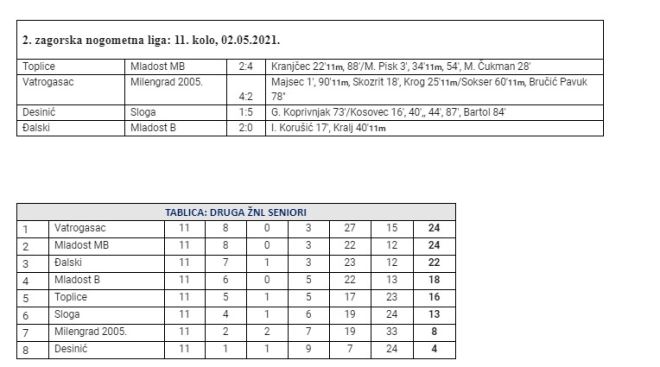 Danas je odigrano 11. kolo 2. zagorske nogometne lige. U derbiju Đalski je sa 2:0 pobijedio Mladost iz Belca, a Mladost MB je stigla do važne gostujuće pobjede kod Toplica 4:2, a vodeći Vatrogasac je istim rezultatom kod kuće pobijedio Milengrad 2005. Sloga je kao gost sa 5:1 pobijedila Desinić. Evo rezultata, strijelaca i ljestvice.
