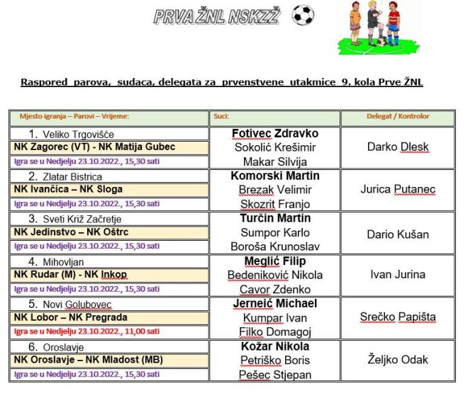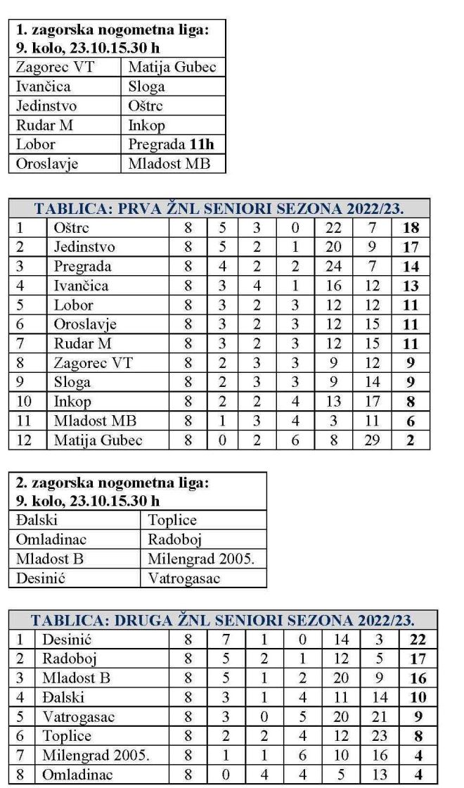 Pred nama je 9. kolo 1. zagorske nogometne lige. Ovo kolo donosi veliki derbi sezone, jer se sastaju dvije vodeće ekipe. Drugo Jedinstvo dočekuje vodeći Oštrc. Pregrada će u goste kod Lobora, a Ivančica dočekuje Slogu. U Velikom Trgovišću Zagorec dočekuje zadnji Matija Gubec, Oroslavje je domaćin Mladosti MB, a Rudar M će dočekati Inkop. Utakmice se igraju u 15.30 sati, osim one u Novom Golubovcu, gdje Lobor dočekuje Pregradu, a koja počinje u 11 sati.