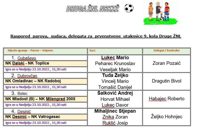 U 2. zagorskoj ligi, u 9. kolu vodeći Desinić će dočekati Vatrogasac, Radoboj gostuje kod zadnjeg Omladinca, Mladost B dočekuje Milengrad 2005., a Đalski Toplice. Utakmice se također igraju danas u 15.30 sati.