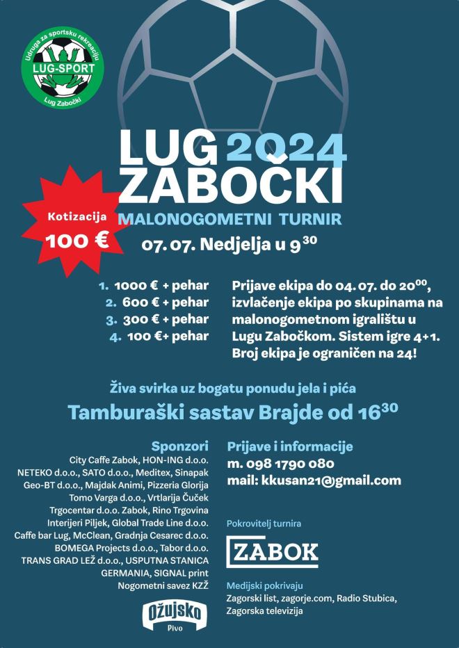 I ovog će se srpnja, točnije u nedjelju 7. srpnja u s početkom u 9,30 sati na travnatom igralištu u Hum Lugu u organizacije vrijedne domaće udruge Lug sport održati malonogometni turnir pod imenom „Lug zabočki“.