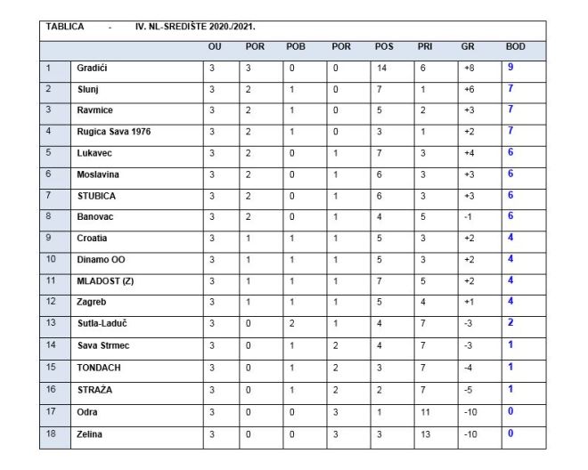Pogled na tablicu nije baš ugodan za zagorske klubove, tek je Stubica u gornjem domu na sedmom mjestu, Mladost drži 11. mjesto, Tondach 15., a Straža 16. mjesto. Nadamo se da će svi zagorski klubovi zabilježiti pomak prema gore već od ovog vikenda. Vrh ljestvice drže Gradići, koji su nakon tri odigrana kola jedini sa stopostotnim učinkom. Uz to igraju i atraktivan nogomet i u tri su utakmice postigli čak 14 golova, od čega je pet potpisao prvi strijelac lige Jurica Brdek, a tri njegov prvi pratitelj Igor Hajduk.